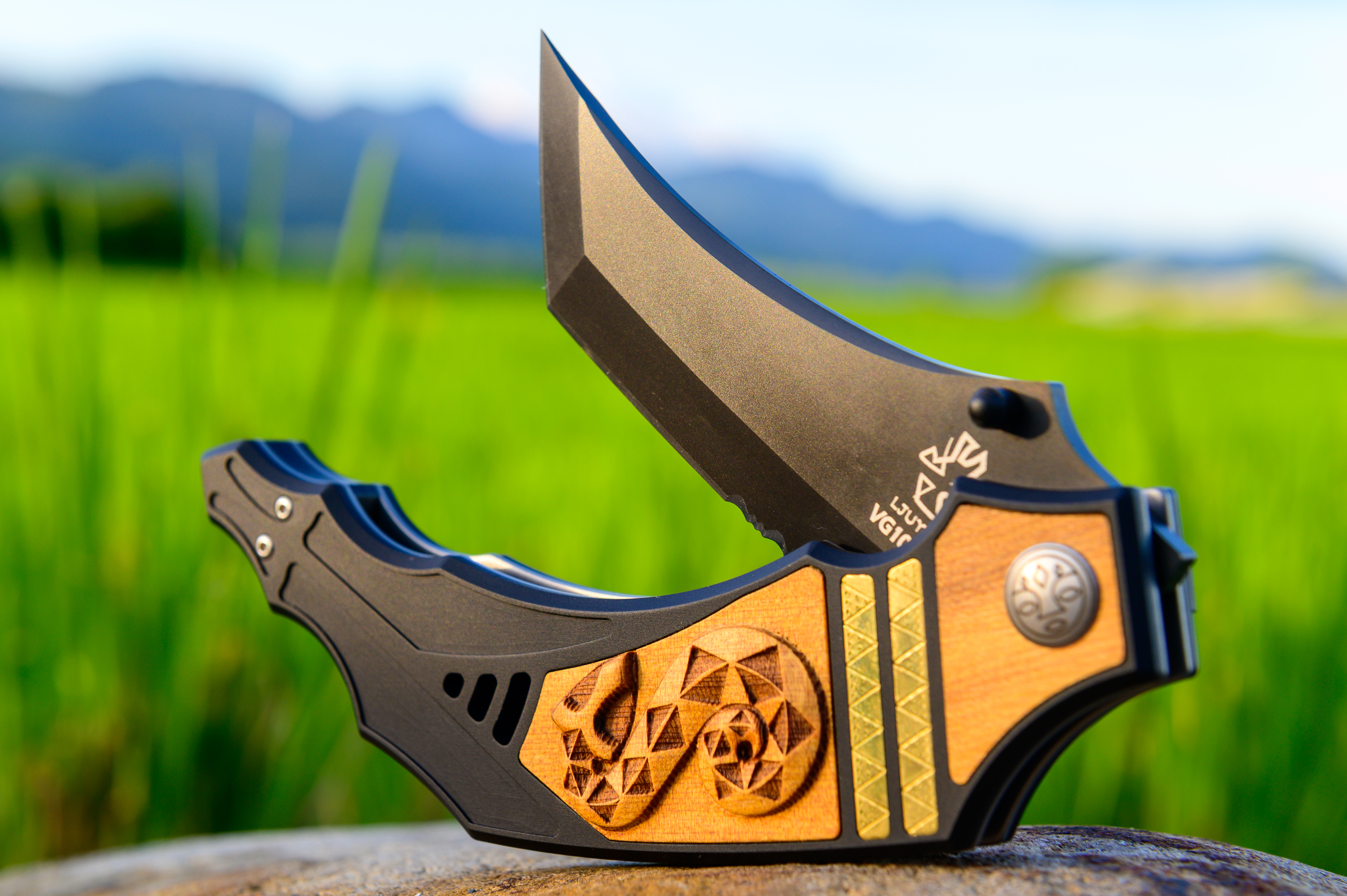 材質說明:  刀刃:VG-10  彈片及墊片:SUS420J2噴沙處理  左右鋁柄:鈦合金/鋁合金/鎳色/霧黑  飾片:台灣肖楠木/銅  墊塊:陽極T6061鋁  皮帶夾:420J2 規格:14.5x4.7x1.6 cm