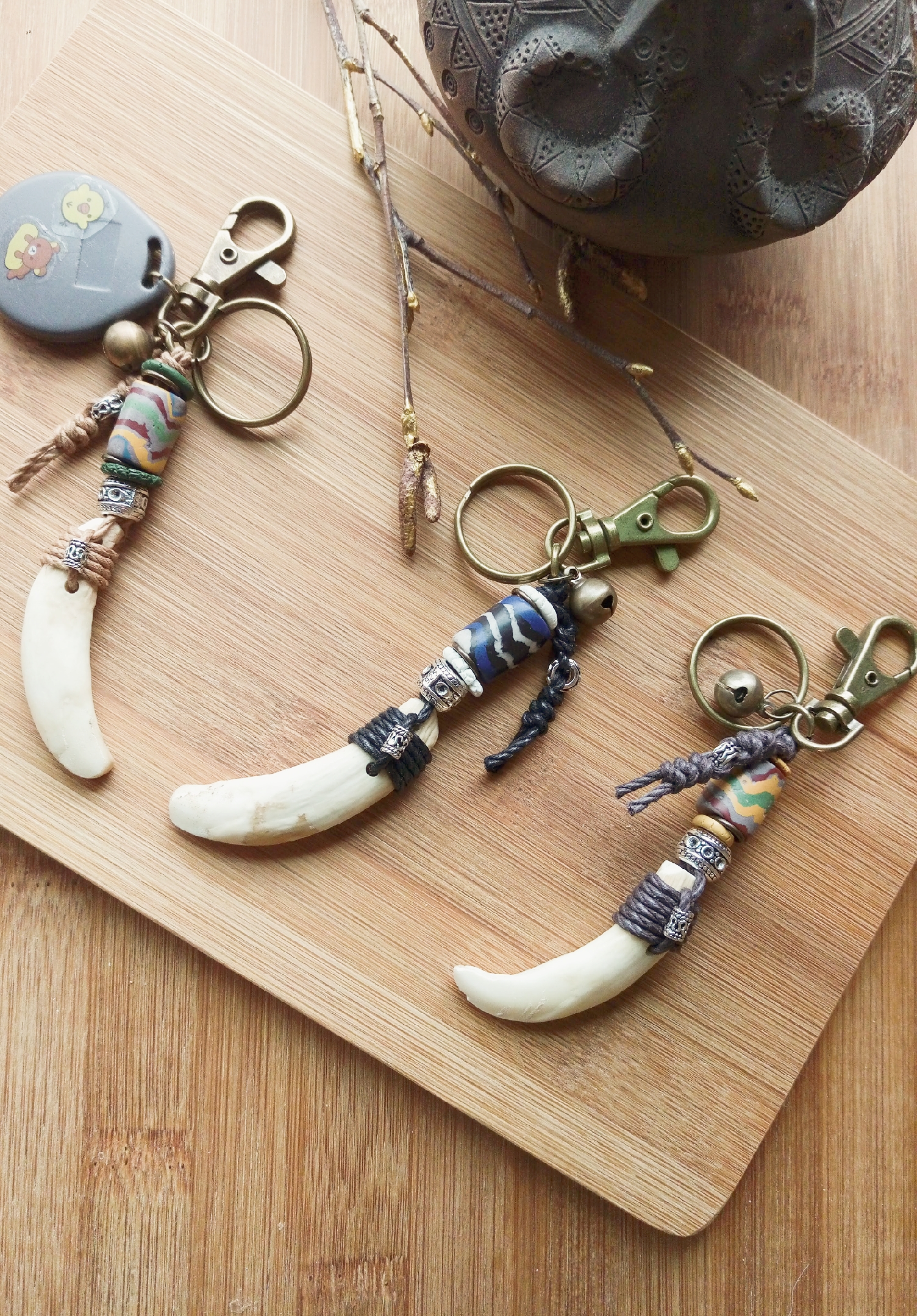 |材質|山豬真牙、琉璃珠、古銀珠、蠟皮繩、銅鈴